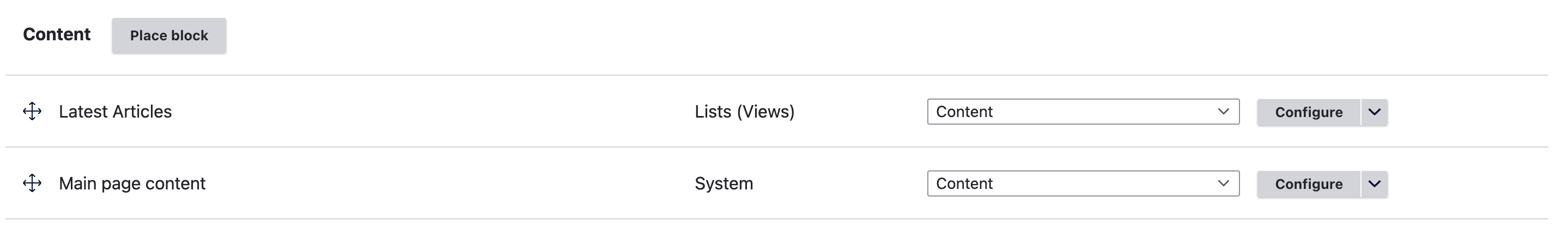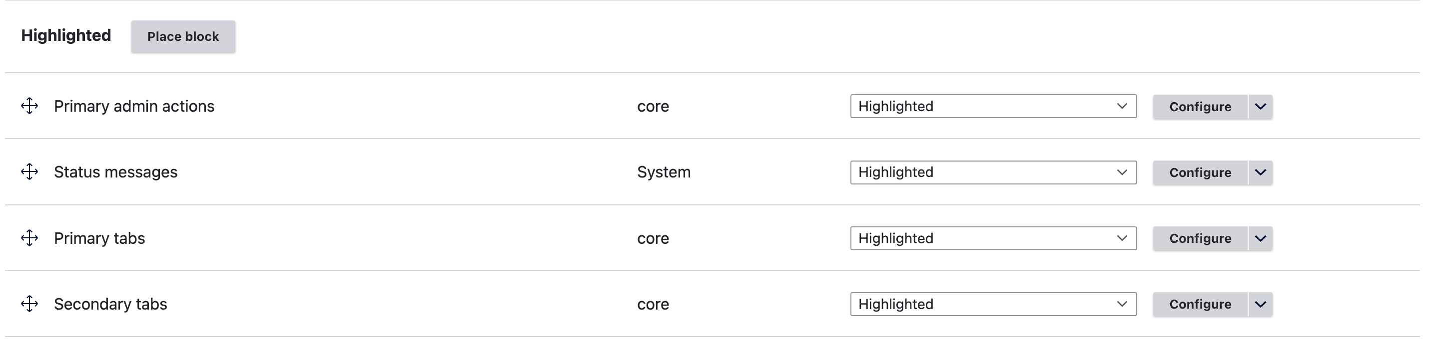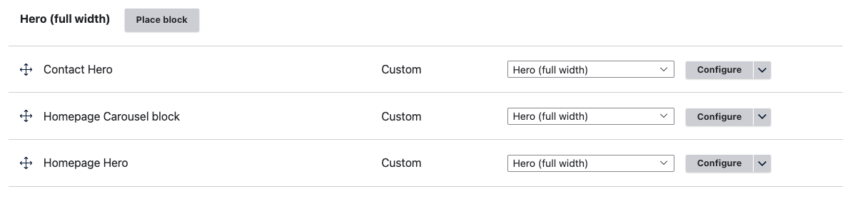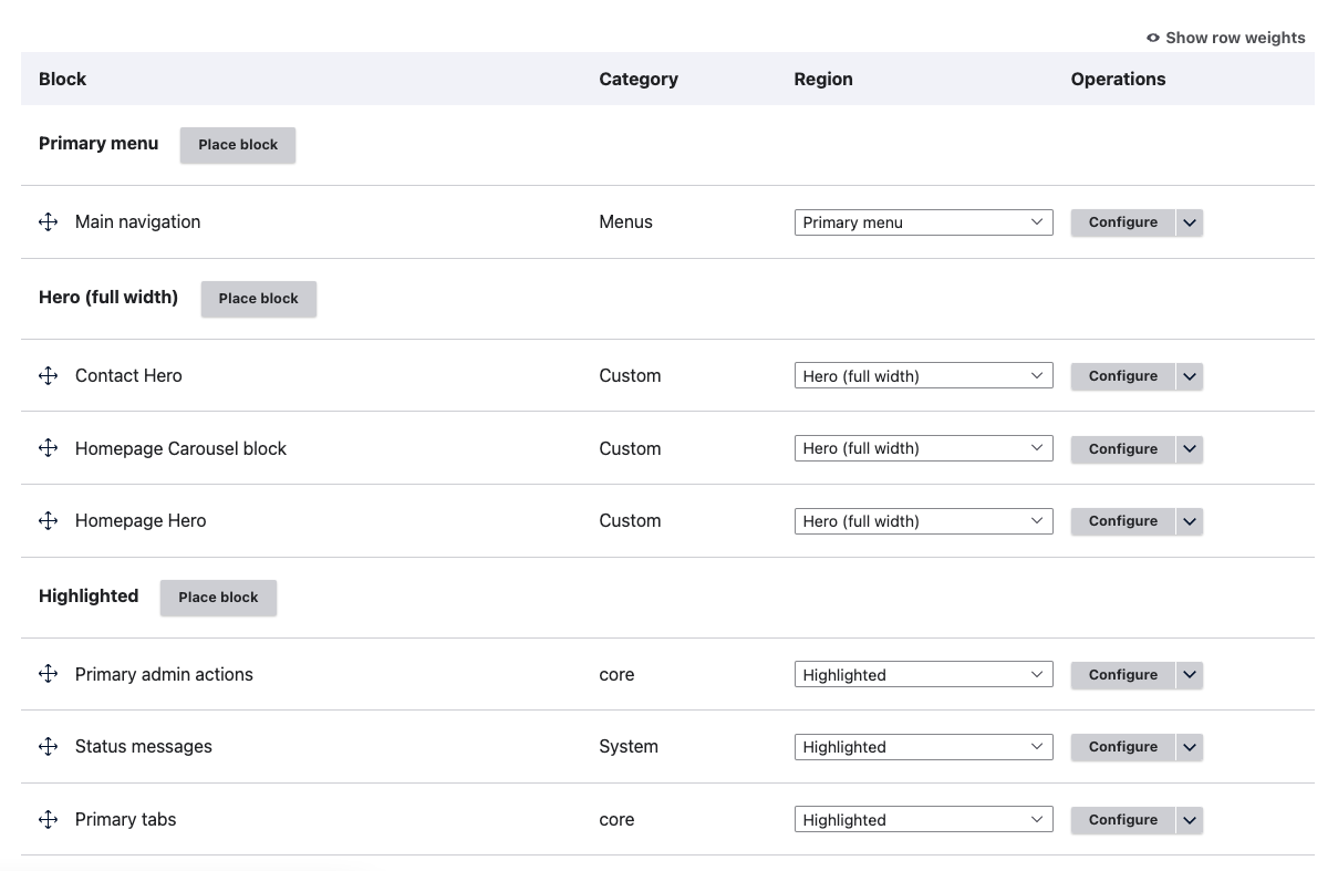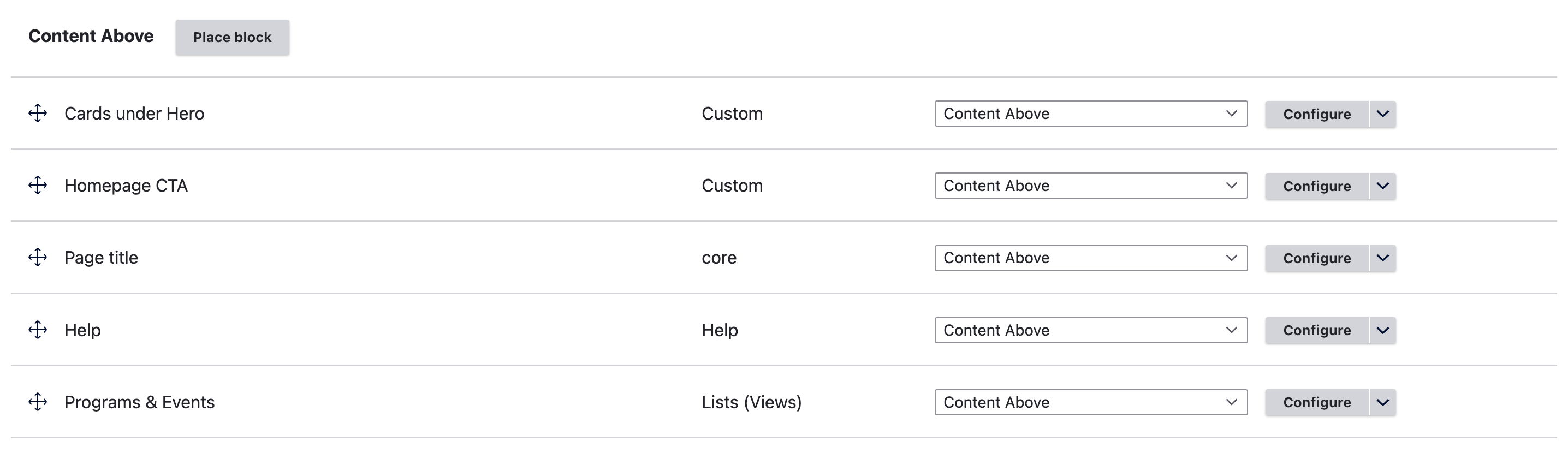 <figure><img src="https://4273077405-files.gitbook.io/~/files/v0/b/gitbook-x-prod.appspot.com/o/spaces%2FUo0V0s9hX9ilJ8VLqR1y%2Fuploads%2Fubf3DIwHOkg75b4VIzn1%2FScreen%20Shot%202023-01-12%20at%203.47.24%20PM.png?alt=media&#x26;token=7967eac0-a8f7-44d8-83f9-aae82e595871" alt=""><figcaption><p>Drupal block layout page</p></figcaption></figure>
