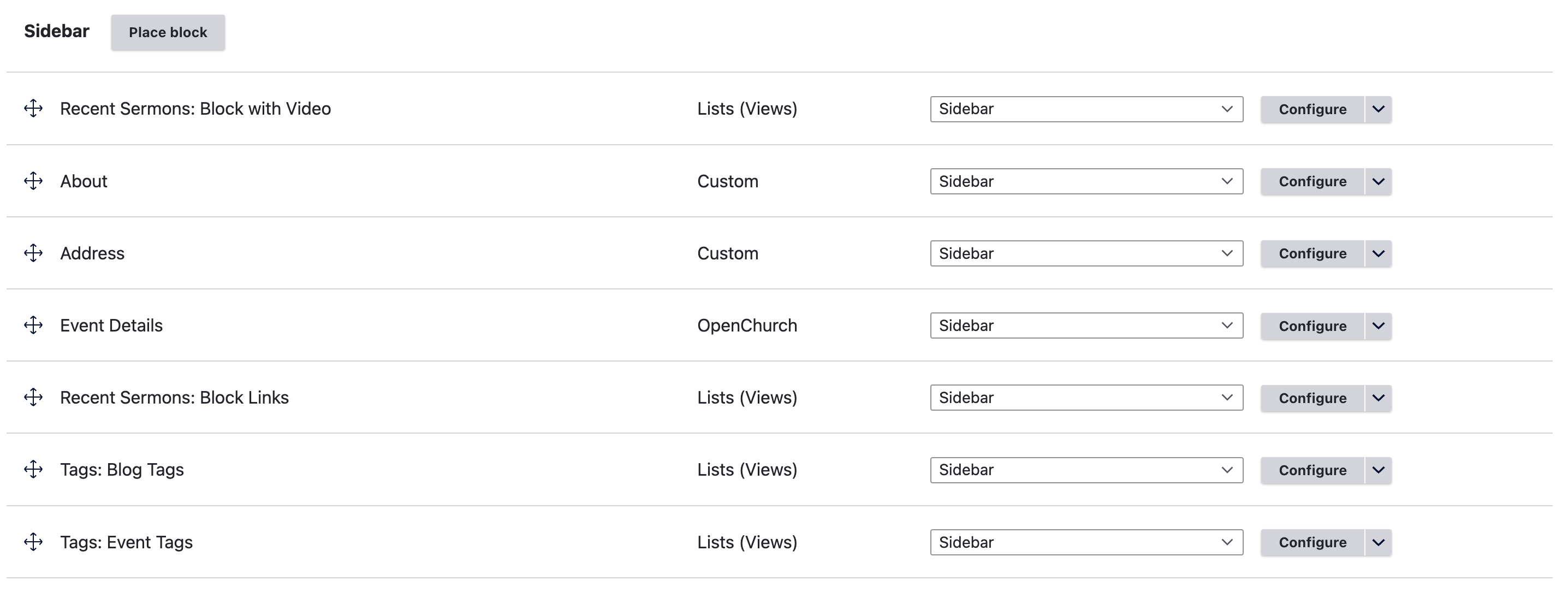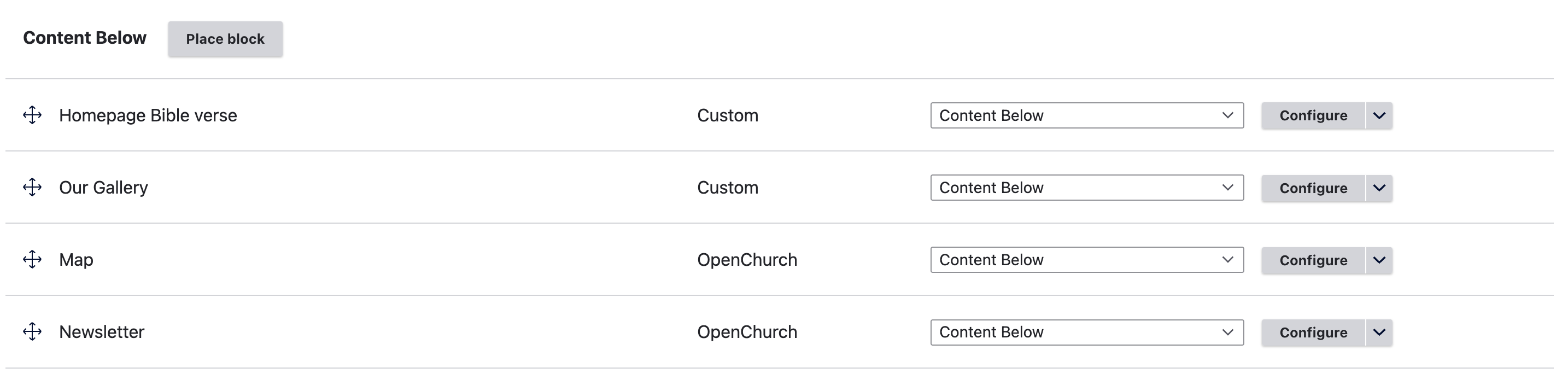 The OpenChurch platform uses the Drupal core "Block layout" page by default to arrange blocks and build landing pages.&#x20;